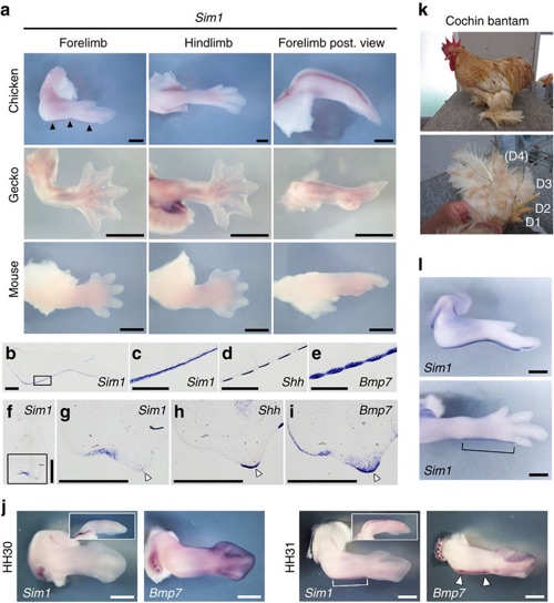 The above finding inspires us to explore the functional roles of ASHCEs in the development of avian-specific features. Our pilot investigation on the limb buds using comparative gene expression analyses between birds and other vertebrates identified a list of genes showing unique expression patterns in birds. In particular, our experiments offer evidence for a specific role of Sim1 in flight feather development and the essential switch on and off regulatory role of ASHCE on its avian-unique expression pattern. This study demonstrates a framework for future study to identify genomic modifications responsible for various levels of lineage-specific phenome innovations by integrating analytical tools from genomics, developmental biology, and paleontology. We postulate that there are more functionally relevant ASHCEs that coordinate the regulation of additional avian class-specific features, some of which might have been shared with their ancestors among theropod dinosaurs and served as genomic mechanisms for macroevolution. Therefore, we plan to perform the comparison of transcriptome and histone modification data from other tissues during embryos between birds and other vertebrate groups, and to further explore the potential roles of ASHCEs in corresponding to the development of other bird features.