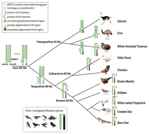 例如,作为此前国际鸟类生命之树项目的其中一个子项目,我们对17种新测序的代表性鸟类的基因组进行研究,还原了鸟类ZW性染色体的演化过程(Science 2014)。随着B10K项目科级别工作的开展,我们将会利用更多的鸟类基因组数据来对整个鸟纲的性染色体演化历史进行更深入的分析。我们将会尤其关注平胸目——现存鸟纲中最接近祖先状态的一支,因为我们之前的研究表明这一支的鸟类拥有同型的性染色体,其ZW染色体对在很大范围内还能进行广泛的同源重组,并拥有大范围的假常染色体区域(PAR),暗示着平胸目的性染色体仍然保持着鸟类祖先性染色体的状态。